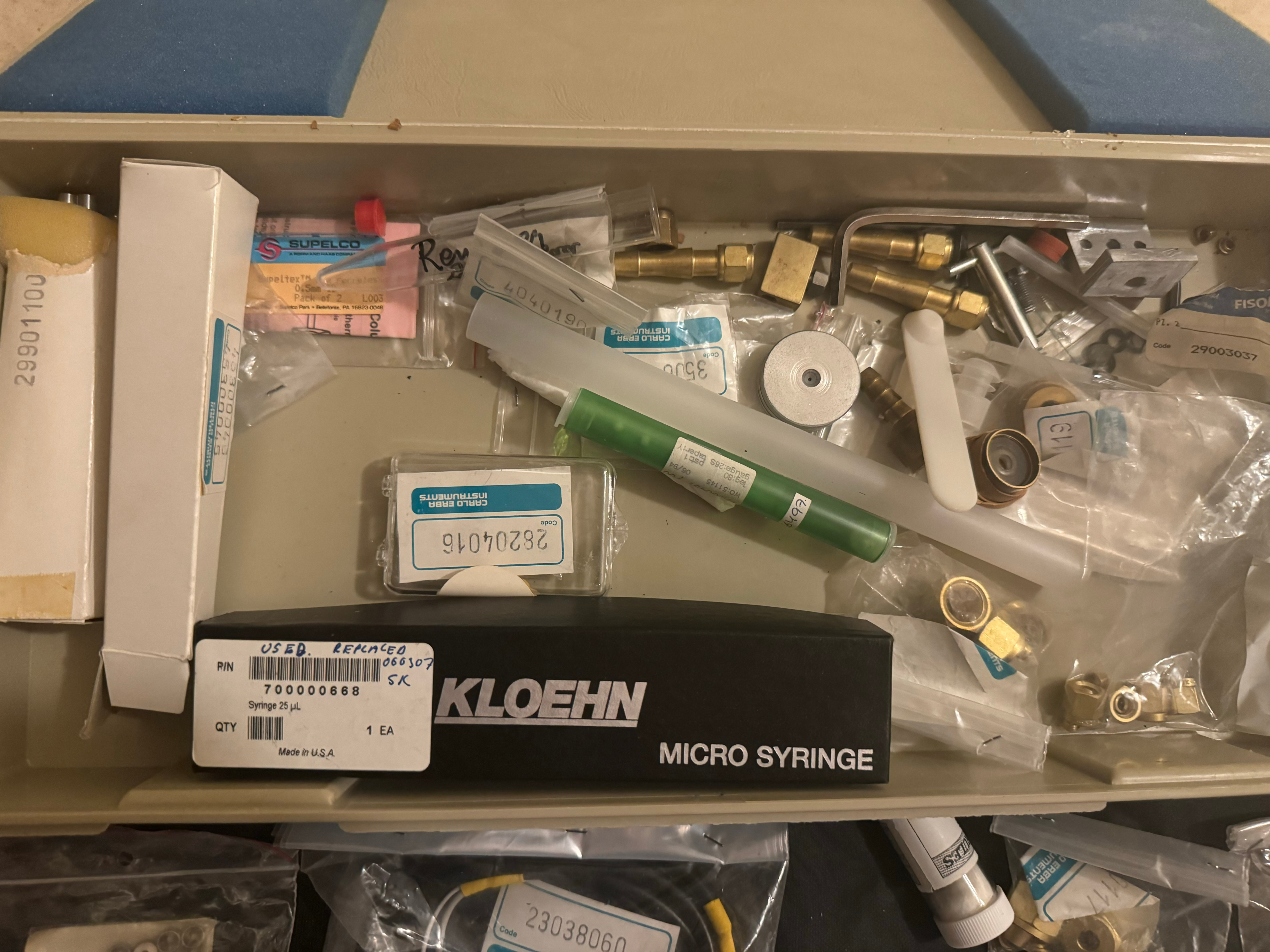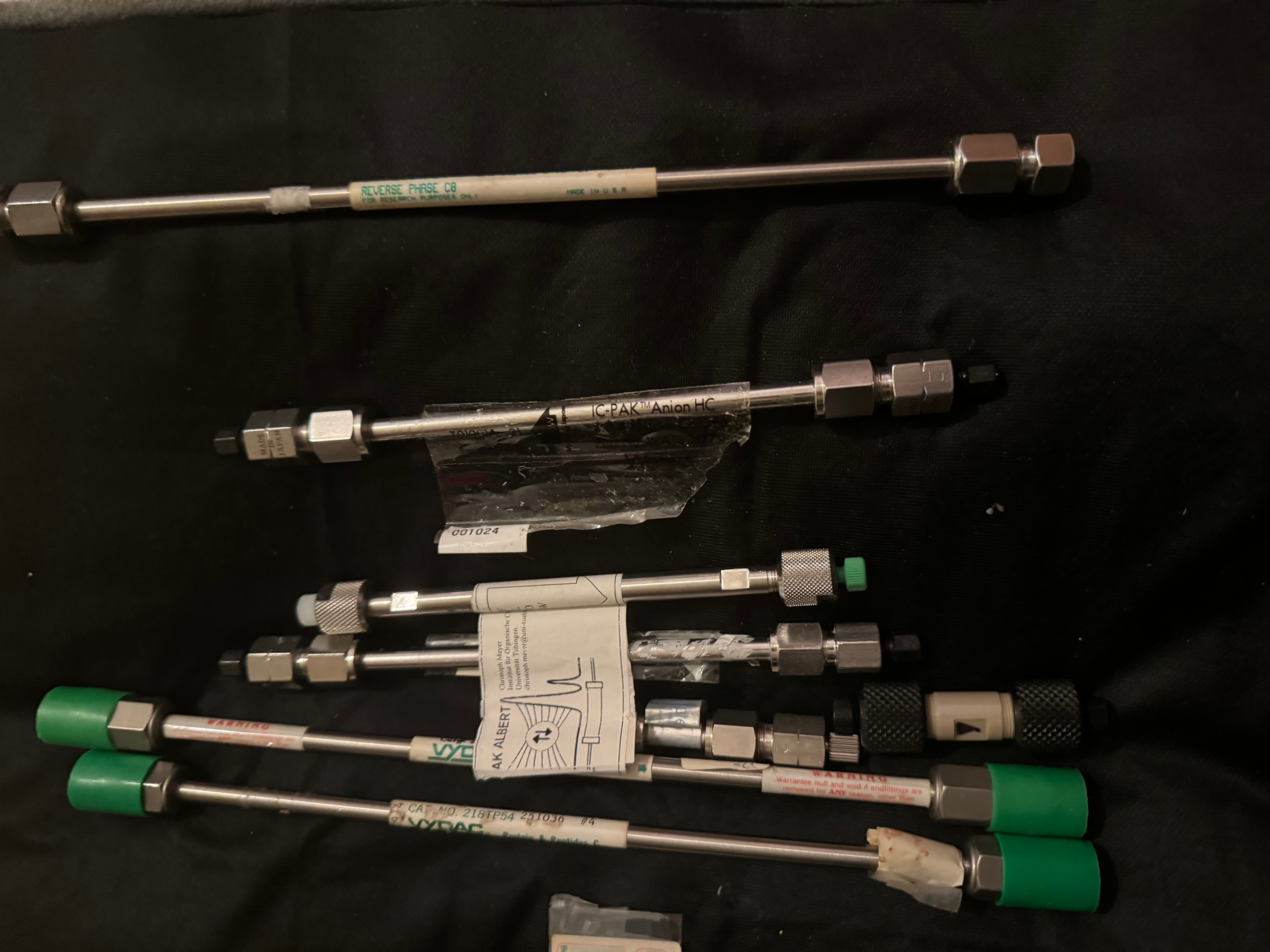 Разные детали для системы HPLC. Только что извлечены из университетского хранилища в Швеции.