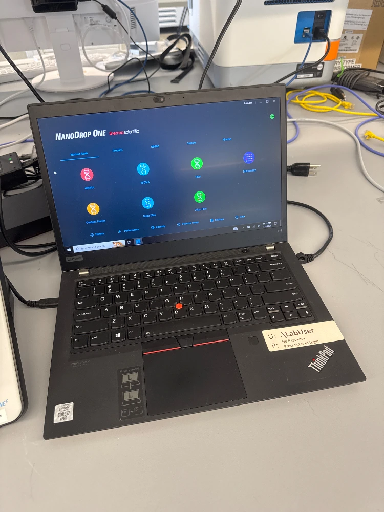 - Конфигурация: Блок спектрофотометра NanoDrop OneC, подключённый к ноутбуку Lenovo ThinkPad с установленным программным обеспечением NanoDrop One